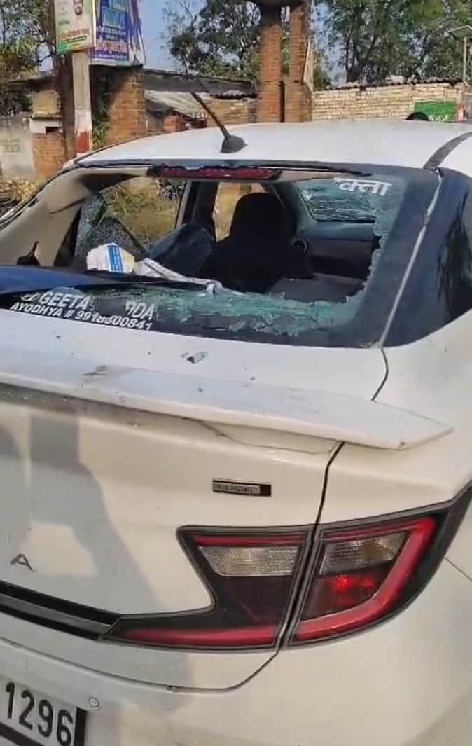 अधिवक्ता प्रभात मिश्रा की कार का टूटा सीसा।