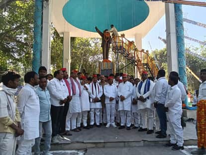 शहर के डॉ. आंबेडकर प्रतिमा स्थल पर माल्यार्पण के बाद मौजूद सपा जिलाध्यक्ष जंगबहादुर यादव, विधाय