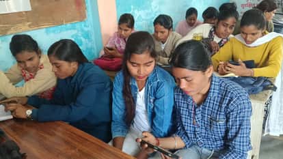 अकबरपुर के मीरानपुर में मोबाइल पर बजट देखतीं छात्राएं।
