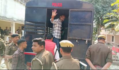 आजीवन कारावास की सजा मिलने के बाद पुलिस वाहन में बैठते समय समर्थकों से अभिवादन करता माफिया अजय