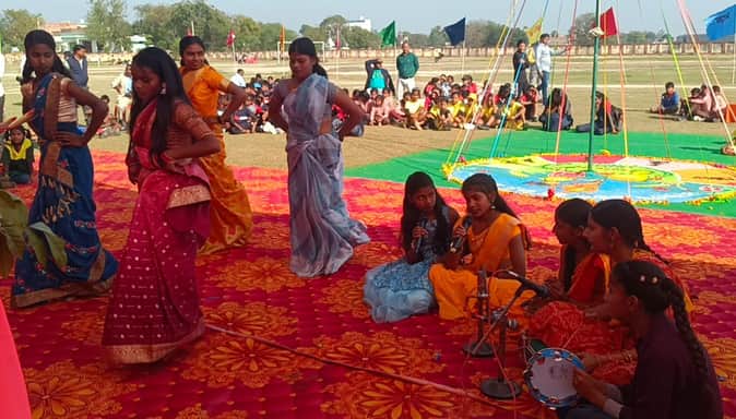 जिला बेसिक क्रीड़ा प्रतियोगिता में सांस्कृतिक कार्यक्रम प्रस्तुत करते बच्चे।-स्रोत: विभाग