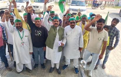 विकास भवन परिसर में प्रदर्शन करते भाकियू पदाधिकारी। -संवाद
