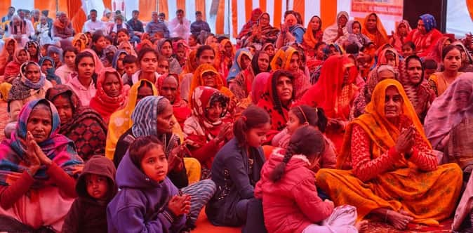 .संग्रामपुर के तिवारीपुर करनाईपुर में कथा सुनते श्रद्धालु। स्रोत-आयोजक