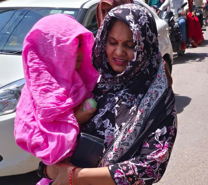 शहर में तेज धूप के दौरान बच्चे का बचाव करती महिला।