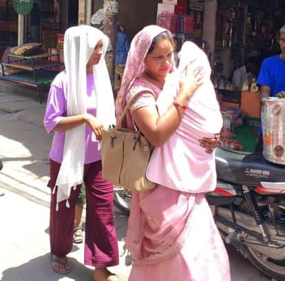 गौरीगंज में रविवार को तेज धूप के दौरान बच्चे का बचाव करती महिला। -संवाद