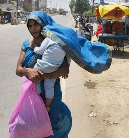 गौरीगंज के सब्जी मंडी में बच्चे को धूप से बचाने का प्रयास करती महिला।-संवाद