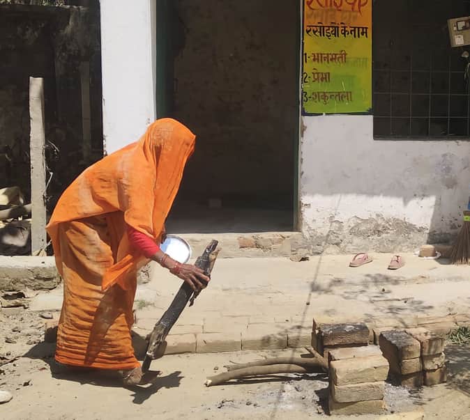 संविलियन विद्यालय धनेशा राजपूत में चूल्हा मे लकड़ी रखती रसोइया।