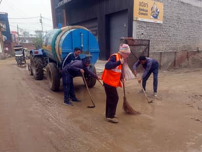 अमरोहा के पुष्कर नगर कॉलोनी में सड़क पर पानी हटाकर साफ-सफाई करते नगर पालिका कर्मचारी। स्रोत ईओ