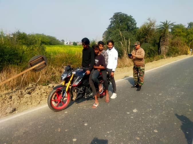 फोटो-32-बाइक पर चार बैठे लोग, वाहन का चालान करती टीम। स्रोत: परिवहन विभाग
