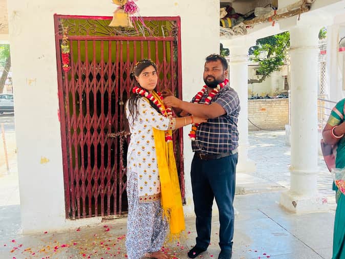 फोटो-15-मंदिर में एक-दूसरे को जयमाला पहनाते युवक व युवती।संवाद