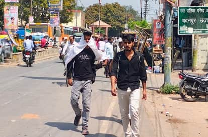 फोटो-29- धूप से बचने के लिए गमछा ओढ़कर जाते युवक। संवाद