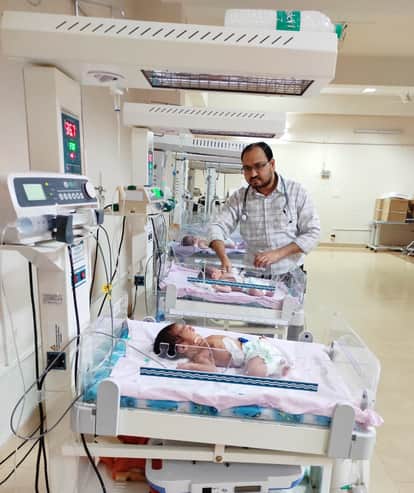 फोटो-23- एसएनसीयू में फोटो थेरेपी के लिए भर्ती नवजातों को देखते डॉ. रंजीत कुमार। स्रोत:कर्मी