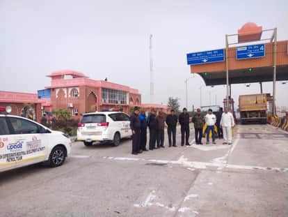 फोटो-19-बुंदेलखंड एक्सप्रेसवे पर तय स्पीड का प्रचार करते यूपीडा के अधिकारी और कर्मचारी। संवाद