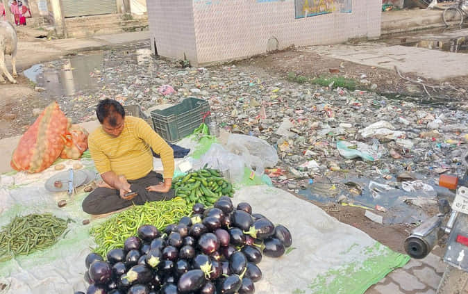 फोटो-29- नाले की गंदगी के पास दुकान लगाए सब्जी विक्रेता।संवाद