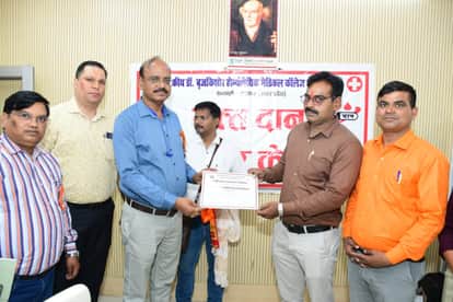 विश्व होम्योपैथी दिवस पर रक्तदान के बाद प्रमाणपत्र वितरित करते कॉलेज के सदस्य।