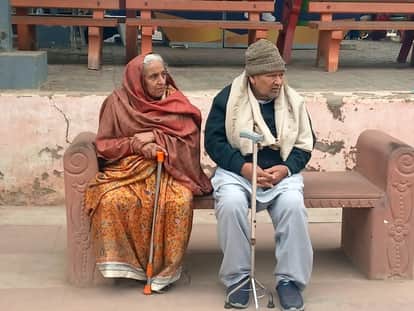 05- राम जन्मभूमि दर्शन पथ पर दर्शन के बाद विश्राम करते बुजुर्ग दंपती।- संवाद