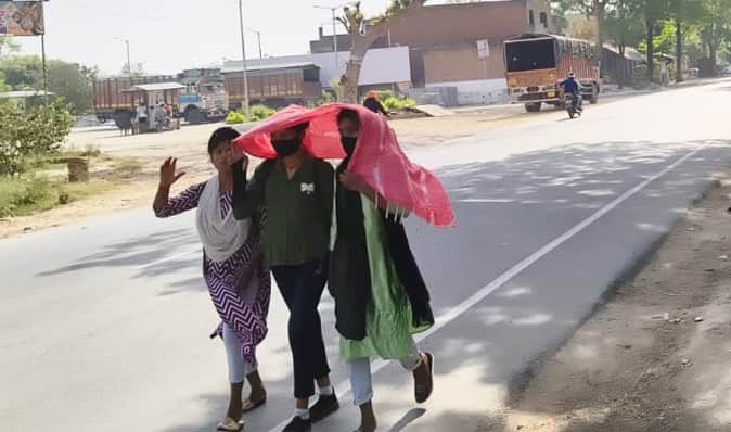 धूप से बचने के लिए एक टुप्पटे के सहारे जाती युवतियां। संवाद