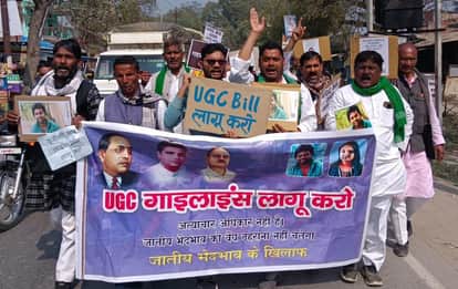 यूजीसी इक्विटी नियमावली लागू करने आदि मांग को लेकर निजामाबाद में प्रदर्शन करते लोग। संवाद