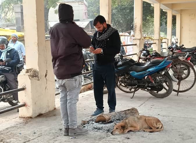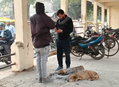 16 ठंड से बचने के लिए जल रहे अलाव के पास बैठा कुत्ता। संवाद