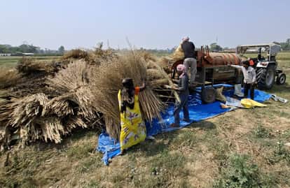मौसम के मिजाज को देखते हुए अहरौला में सरसो की मंडाई करते किसान। संवाद