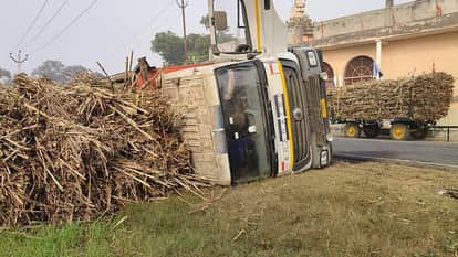 हलालपुर मंदिर के पास पलटा गन्ने से लदा ट्रक। संवाद