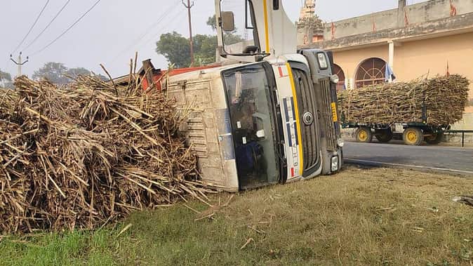 -- कोहरे में गन्ने का ट्रक पलटने से खंभा टूटा