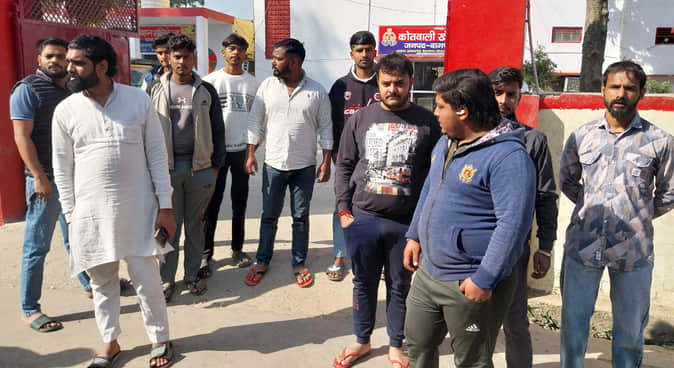 शाकाहारी बिरयानी में हड्डी निकलने के बाद खेकड़ा कोतवाली में विरोध जतातेे भाजपा कार्यकर्ता। संवा