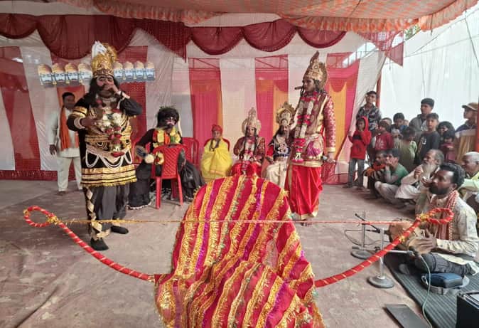 धनुष यज्ञ रामविवाह का मंचन करते अयोध्या धाम से आए कलाकार।