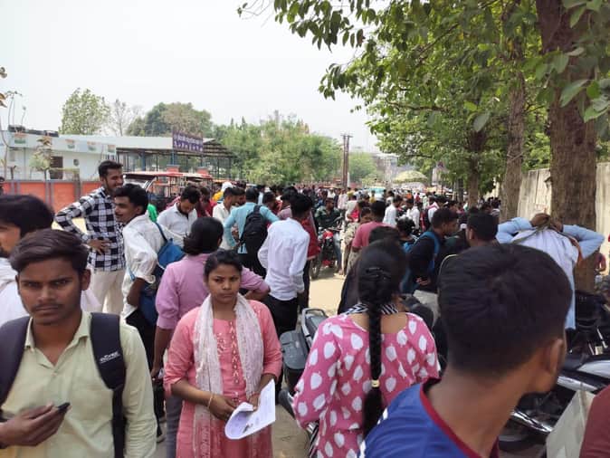 बहराइच के महाराज सिंह इंटर कॉलेज से होमगार्ड भर्ती परीक्षा के दौरान बाहर खड़े लोग।