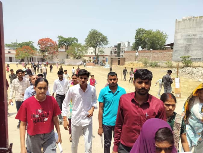 बहराइच के महाराज सिंह इंटर कॉलेज से होमगार्ड भर्ती की परीक्षा देकर बाहर निकलते परीक्षार्थी।