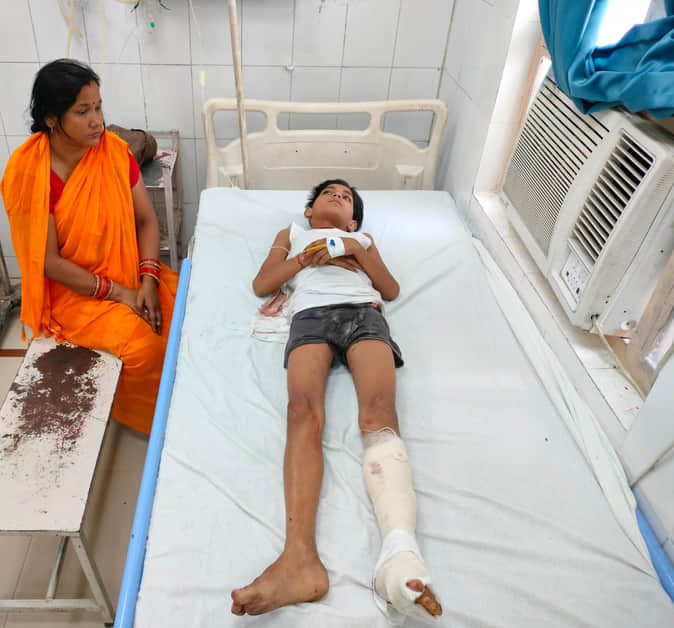 - फोटो : बौंडी के मंगरवल में घड़ियाल के हमले में घायल नैतिक व मौजूद परिजन।