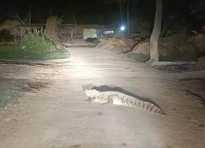 - फोटो : महसी के बमभौरी गांव में सड़क पर निकला मगरमच्छ।