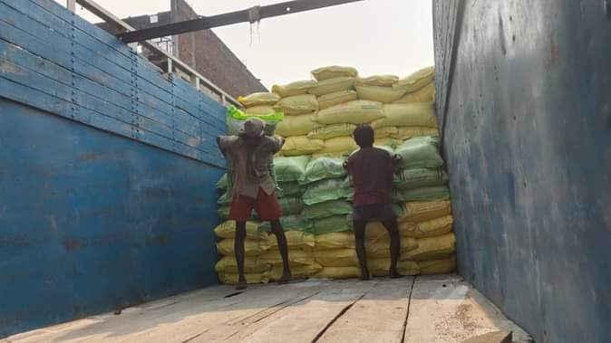 नवाबगंज के बहुउद्देशीय ग्रामीण सहकारी समिति पर उतारी जा रही डीएपी। -संवाद