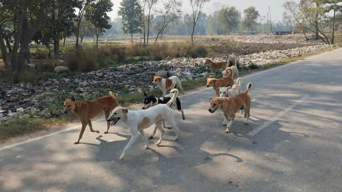 नवाबगंज में घूमता कुत्तों का झुंड।