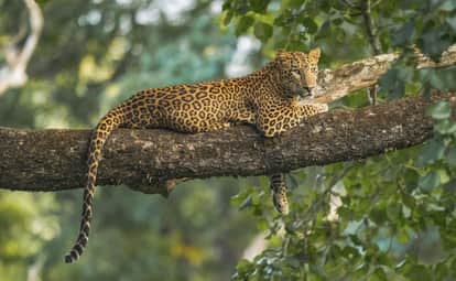 कतर्नियाघाट संरक्षित वनक्षेत्र में पेड़ पर बैठा तेंदुआ। (फाइल फोटो)