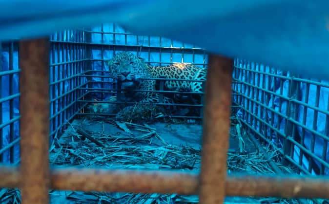 - फोटो : गौरिया गांव में वन विभाग द्वारा पिंजड़े में कैद तेंदुआ।