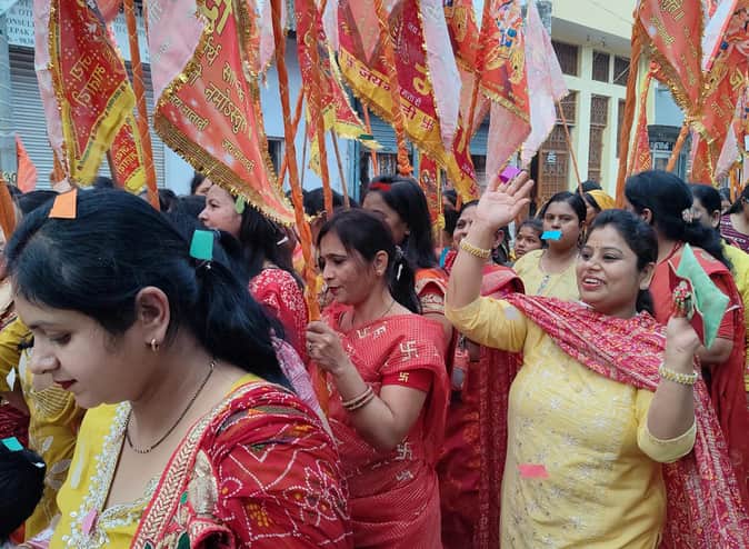 नानपारा में निकाली गई शोभायात्रा में झूमतीं महिला श्रद्धालु। -संवाद