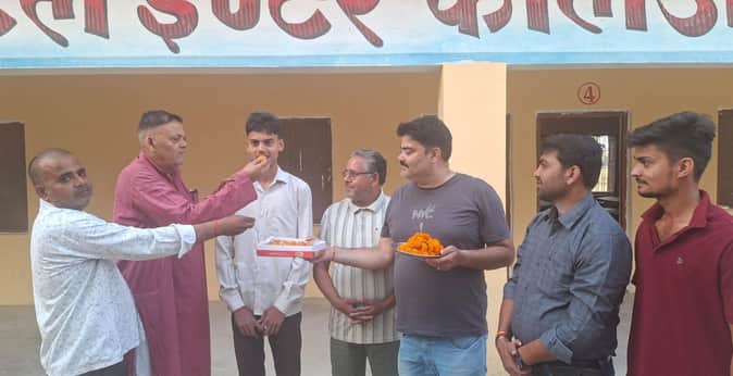 यूपी बोर्ड इंटरमीडिएट में 91.60 प्रतिशत लाकर जिला टॉपर रहे हरिकेश शर्मा को मिठाई खिलाते शिक्ष