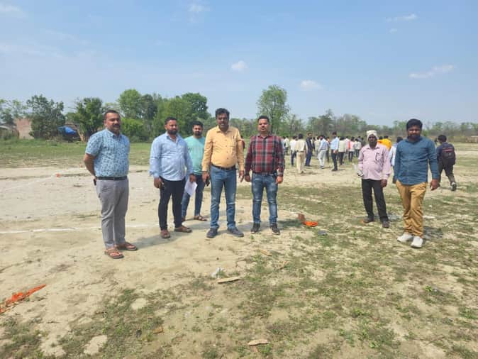भरतपुर गांव के लिए चिह्नित जमीन की पैमाइश करती टीम।