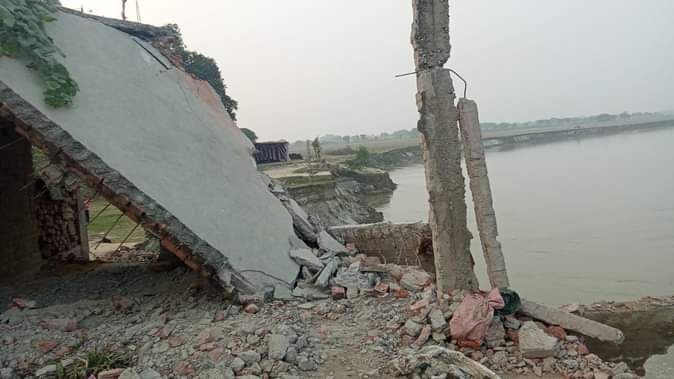 बैरिया क्षेत्र के गोपालनगर टाड़ी गांव में मकान के बचे अवशेष भाग को ठोकर मारती सरयू नदी की लहरें