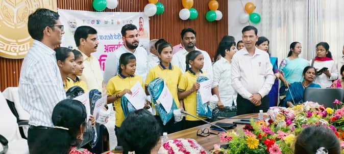 अंतरराष्ट्रीय महिला दिवस पर विकास भवन परिसर में आयोजित छात्राओं को सम्मानित करते जिलाधिकारी एम