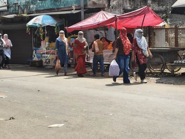 नगर में धूप से बचाव के चेहरा ढककर अपने गंतव्य को जाती युवतियां। संवाद