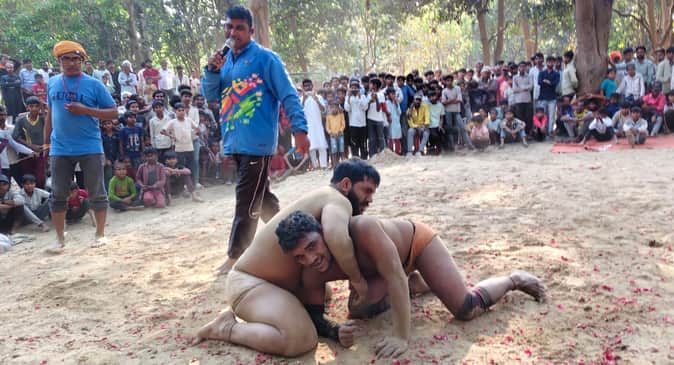 फोटो-26-बलरामपुर के मध्यनगर में दमखम दिखाते पहलवान ।-संवाद