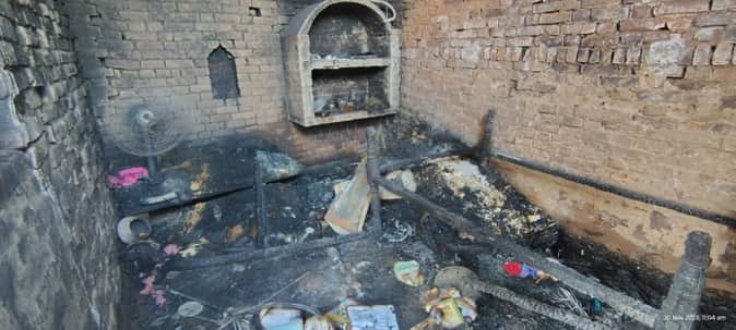 -बलरामपुर के कालिंजर ग्रिंट में सिलिंडर फटने से जला सामान ।-संवाद