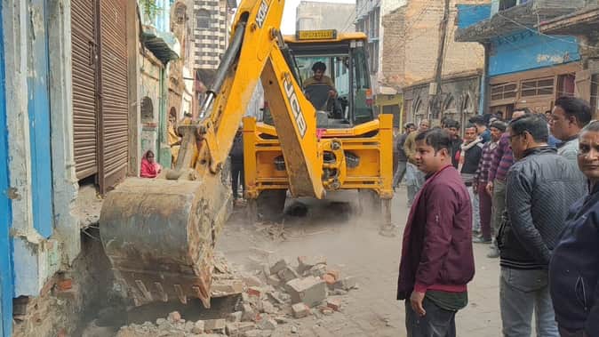 बलरामपुर के बड़ा पुल चौराहे के पास जेसीबी से हटाया जा रहा अतिक्रमण ।