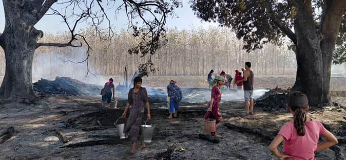 मंगलवार को आग जंगल किनारे बसे थारू गांव सगरापुर तक पहुंच गई। देखते ही देखते लपटों ने गांव के खेतों और लकड़ियों को अपनी चपेट में ले लिया। इस आगजनी में परदेसी, राकेश, बैदु, घनश्याम, भागीरथी, राम तीरथ, गुड्डू प्रसाद, भग्गन, पुजारी, हनुमान, राम जोन्हाई, भोला, हरिप्रसाद, राम सकल, प्रेम सागर, श्रवण कुमार, कैलाश नाथ, दिनेश, प्रदीप कुमार, चिनके सहित दर्जनों थारू किसानों की गन्ने की फसल, पेड़ी और खाना पकाने के लिए इकट्ठा की गई लकड़ी जलकर राख हो गई। जनकपुर रेंज के वन दरोगा वीर बहादुर सिंह, अखिलेश गुप्ता, धर्मेंद्र यादव, वाचर मोहम्मद इरफान ने मौके पर पहुंच कर आग बुझाने का प्रयास किया। रेंजर प्रभात वर्मा ने बताया कि आग लगने के कारणों की जांच की जा रही है। थारू जनजातीय संघ के अध्यक्ष मदन जयसवाल भी मौके पर पहुंचे और ग्रामीणों के साथ मिलकर आग बुझाने में जुट गए। काफी मशक्कत के बाद आंशिक रूप से आग पर काबू पाया जा सका, लेकिन कई स्थानों पर अभी भी धधक जारी है।