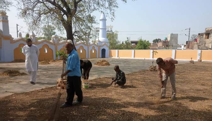 बलरामपुर के नौशहरा स्थित मस्जिद में साफ सफाई करते लोग ।-संवाद