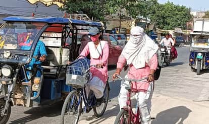 फोटो-27-बलरामपुर के गोंडा रोड पर धूप से बचने के लिए दुपट्टा लपेटकर जाती छात्राएं ।-संवाद