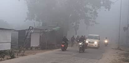 -बलरामपुर में रविवार को कोहरे के बीच लाइट जलाकर गुजरते वाहन ।-संवाद