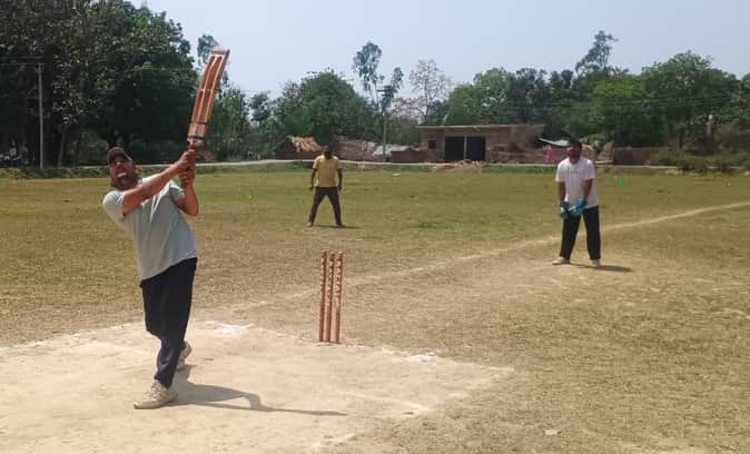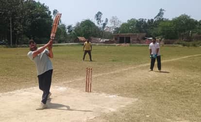 फोटो-27- बलरामपुर के शिवपुरा मैदान में आयोजित क्रिकेट प्रतियोगिता में शॉट लगाते खिलाड़ी। स्रो